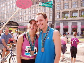 But I headed over to Columbus and Michigan and found my Dad and Chad. I started crying because I had left Jason when he was in pain and I didn't know where he was or if he was ok. Eventually we heard that he was ok, and so we waited for him to come by. We were exhausted and sweaty and gross, but we had again completed a marathon. I was so happy that I didn't quit even though I wanted to. A sense of accomplishment, even though the goal I had worked on all summer was out the window before the race even started.